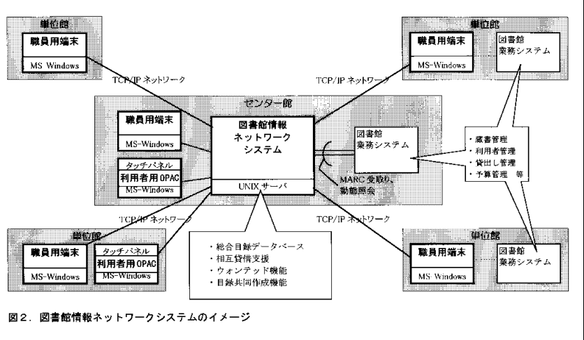 図書館情報ネットワークシステムは、地域情報環境の整備に重点をおいて検討され、地域における公共図書館間のネットワークにより図書館サービスの充実を図ることを要件とし(図1)、相互貸借を電子的に支援する機能、ウオンテッド(所蔵等情報を提供依頼する掲示板)機能、および郷土資料等の目録共同作成を支援する簡易な書誌ユティリティ的機能を主要機能としている。また、端末ソフトウェアとしては、司書をはじめとする図書館職員が高度な書誌検索を行える職員向けの端末機能と、利用者が容易に書誌検索ができるタッチパネル式のOPAC端末機能を用意した。(図2)
