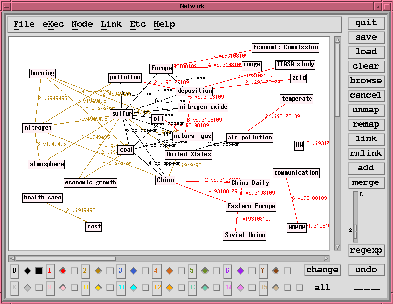ユーザが複数の文献を組み合わせた場合、複数の著者のそれぞれの問題に対する視点か らの見解が、分析結果として一つにマージされて生成される。これはより多面的に問題 の関連構造を可視化するための機能である。実際の画面では、複数の文献の場合は文献 ごとにリンクの色分けを行い、さらに共通部分を分離できるように色分けを行っている。 これによって文献間における用語の関連が、リンクの色の違いをとおして、明確に認識 できる。図3は2つの文献を同時にマップした例であり、それぞれの文献ごとに色分け されており、全体的に出現頻度を2以上に限定している。リンクの色が黒でco_appearと 表示されている組み合わせは、2つ以上の文献に共通に出現した組み合わせである。黒 色以外のリンクの上には、出現頻度のほかに、文献の識別番号を表示しており、タイト ルを知る手がかりにしている。