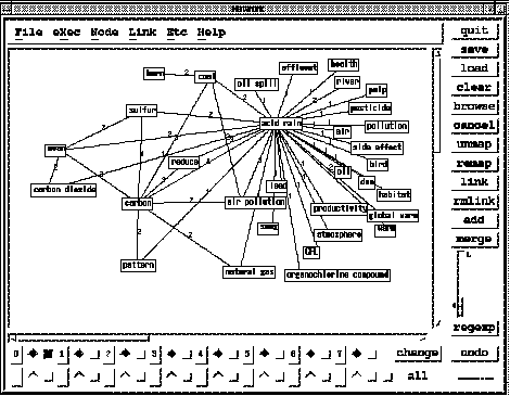 本システムが生成する概念ネットワークは、知識ベースから生成された仮説の構造と 見なすことができる。仮説は知識として利用するためには、検証が必要である。そのた め生成された概念間の関係が妥当がどうか、確認する機能が必要である。ネットワーク エディタにマップされたノード上の用語は、文献のキーワードインデックスに自動的に リンクされている。このノード上の用語が出現する文献のタイトルや文章を一覧表示す る機能が、NCSA Mosaic と連結して用意されており、用語がどのような文脈で使われて いるかを即座に確認することができる。