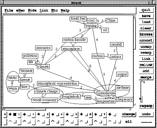 概念ネットワークは単にマップされるだけでなく、ネットワークエディタ上でKJ法 による試行錯誤的な発想支援活動を行うことができる。ノードやリンクの追加と削除、 およびノードの移動とグルーピングなどが自由に行える。また初期配置の段階で、文章 上で関係のありそうなものは、あらかじめ線分で連結されており、自動初期配置機能を 取り入れている。同時に関係ないものの間にはリンクを生成しないようにしており、自 動的なグルーピング機能も備えている。また利用頻度の高い用語を含む比較的長い文献 から概念ネットワークを生成すると、非常に多くの組み合わせを生成する場合がある。 そのため生成した概念ネットワークを出現頻度、特定の用語などから自由に絞り込んで、 ネットワークを見やすくする機能を備えている。