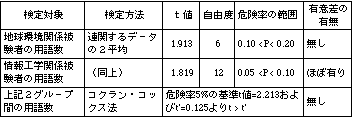 情報工学関係の被験者の結果から、仮説棄却の危険率Pは0.05 < P < 0.10となり、有意 差が例外的に認められるぎりぎりの危険率を示している。検定の趣旨に従えば情報工学 関係の被験者には、用語数に強い増加傾向が現われていると言える。