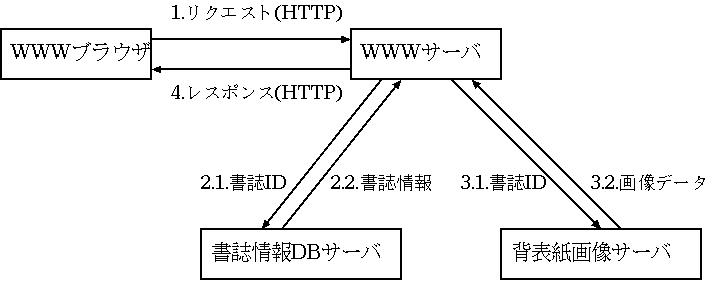 今回の試作では、 WWW サーバ、書誌情報 DB サーバ、背表紙画像サーバは物理的にも分離している。 WWW サーバは、ごく一般的な Apache2.0.51 を利用し、 PHP 言語を使用して WWW サーバ上で動作するプログラムを記述した。 書誌情報 DB サーバは、データベースサーバに MySQL3.23.58 を利用し、 WWW サーバからの問い合わせにネットワーク経由で応答する。 背表紙画像サーバは、データベースサーバに MySQL4.0.20d を利用し、 WWW サーバからの問い合わせにネットワーク経由で応答する。