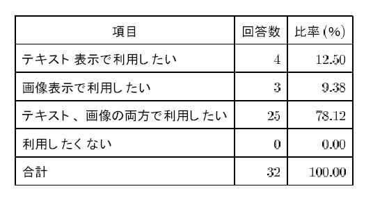 表 2 では、利用者全員が関連書誌表示システムを何らかの形で利用したいという回答を出しており、システムの需要は高いと思われる。 表示形式については、画像とテキストの両方で利用したいという意見が 78% に上っている。 この結果は、テキストと画像のそれぞれの長所を組み合わせて利用したいという意見が多いことを示していると考えられる。