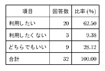 一方、表 3 より、蔵書検索システムにおいて画像表示を利用したいという回答は 62.5% で関連書誌表示システムの場合より低くなった。 アンケートの意見から推察すると、蔵書検索においては探す書誌が特定されている場合が多く、検索結果はテキスト表示で十分であると考えているようである。