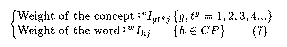 English)", the overlapped part with same sense is obtained as shown Fig.3 by comparing with the concept space of "x[X". This overlapped part is defined as the concept path narrowed down the concept space and estimated by the appearance frequency of the concept path. In this approach, obtaining semantic frequency in the document, the weight of the concept is estimated by appearance frequency for each elements of Pktkj. The weight of the concept cIktkj is estimated as follows: