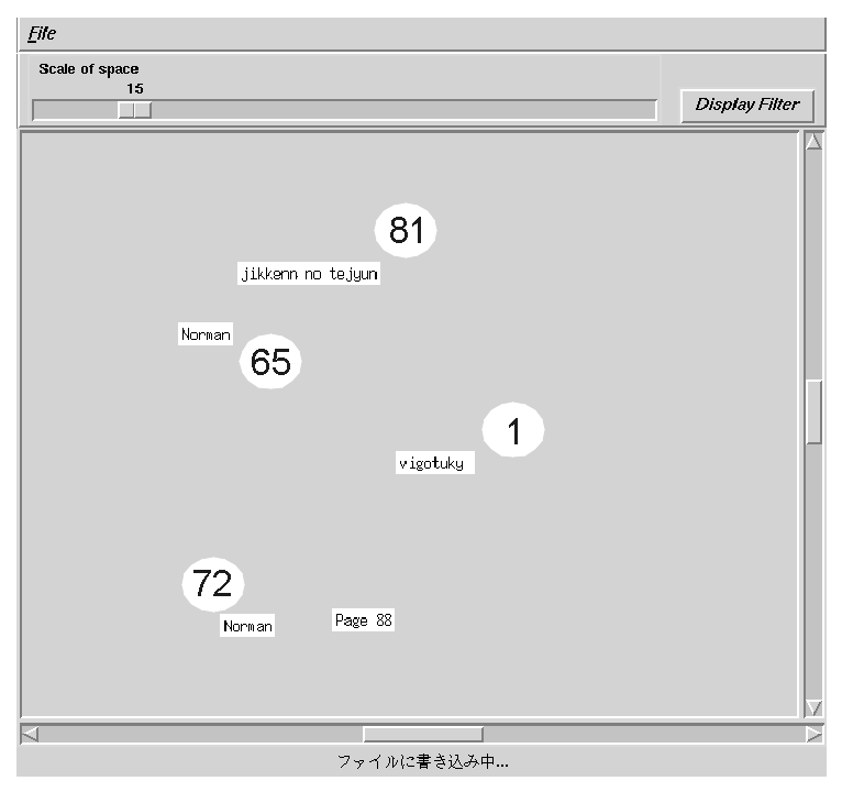 ここでは,博士課程3年の大学院学生が8ヵ月にシステムを使用し,90ページの ノートを入力してある時点での実験について簡単に述べる.被験者は,博士論 文を執筆しているので関連研究を見直したい(記述洩れがないかを確認したい) という問題意識を実験を開始する際に持っていた.