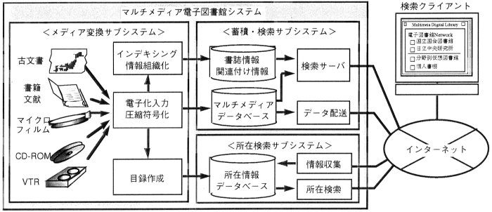 マルチメディア電子図書館システムは,多少単純化すると,情報の入 力,蓄積,検索,配送,課金などの機能を備える,以下の4つのサブシス テムで構成される(図1).