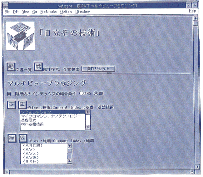 メディア変換サブシステムとしては,印刷文書の目次認識を行い,その 認識結果のデータから検索を行う機能を試作した.蓄積・検索サブシステ ムには,マルチメディア文書管理サーバBibliotheca/InfoShareと全文検 索サーバBibliotheca/TextSearchを用いて,ビデオや音声情報を含むマル チメディア文書(HTML文書)を蓄積管理する.これらのサーバは,WWW (World-Wide Web) のクライアントからHTTPプロトコルでアクセスできる ように,ゲートウェイソフトBibliotheca/Gatewayを介してインターネッ トに接続している.利用者は,MosaicまたはNetscapeナビゲータから,上 記のBibliothecaで管理するHTML文書を全文検索機能で検索し,閲覧する ことができる.図3はNetscapeからアクセスしたときの Bibliotheca/InfoShareの分類型検索の画面例である.